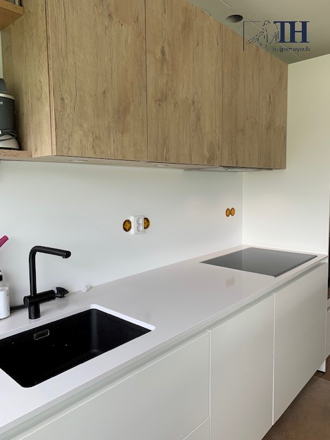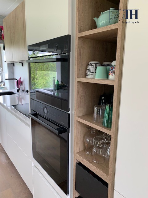 Bij een klant in Huysch | TH-Keuken AmsterdamBij de klant in Huysch | TH-Keuken Amsterdam Onlangs heeft het TH-Team weer een mooie keuken opgeleverd in Amsterdam. De insteek van de klant was een strakke keuken met warme, natuurlijk elementen. De TH-Adviseur heeft dit in deze keuken toegepast door de bovenste lade, de bovenkastjes en het open schap in een houtlook tint uit te voeren. De zwarte apparatuur, kraan en spoelbak zorgen voor een modern, speels, effect! Terug naar overzichtKeuken inspiratie Dibesee Design Keuken in Weesp Bekijk project TH-Keuken in Amsterdam West Bekijk project Moderne TH-Keuken IJburg Bekijk project TH-Keuken in Amsterdam Bekijk project TH-Keuken met ingebouwde robot stofzuiger Haarlem Bekijk project